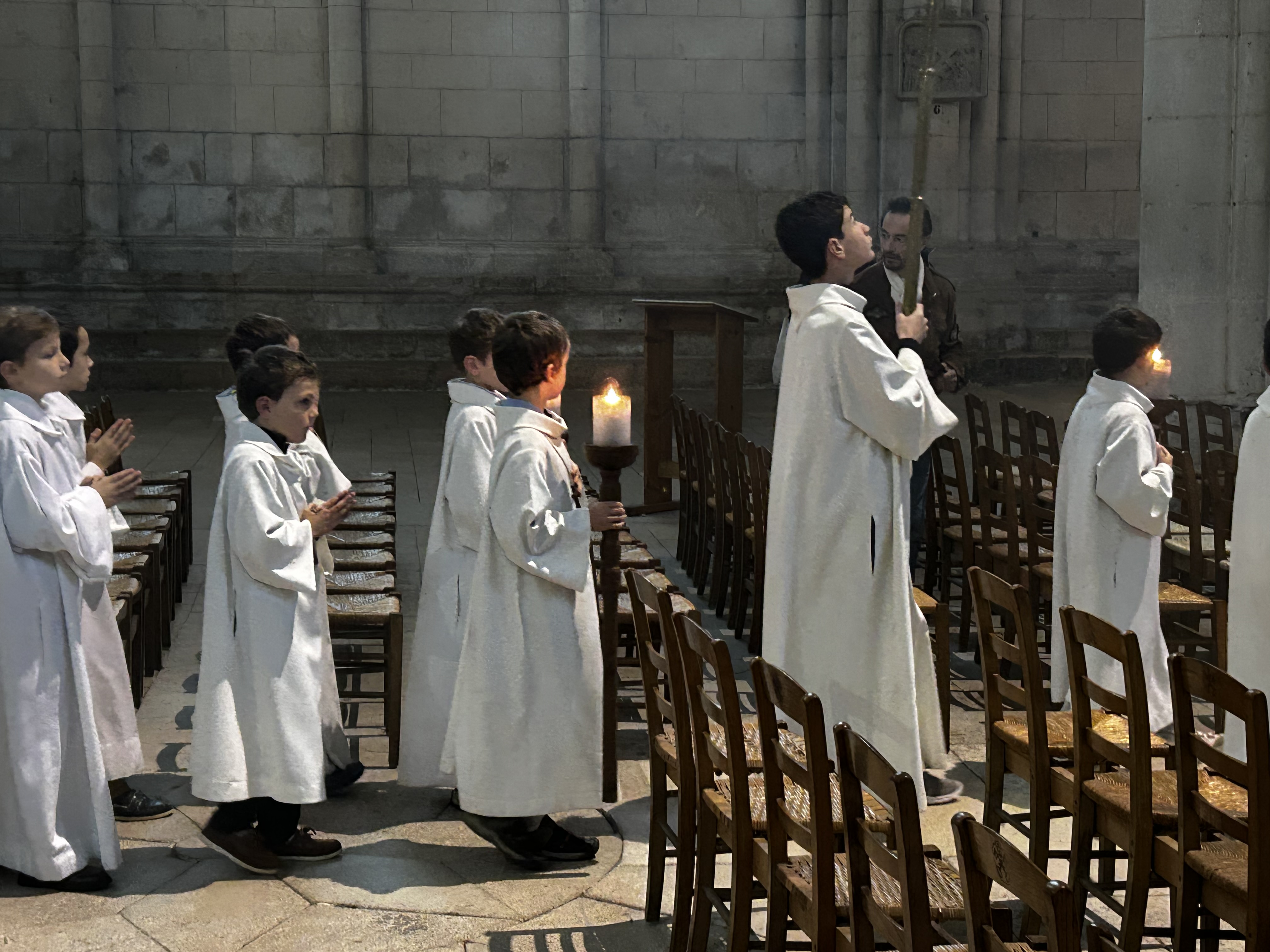It is the Sunday morning High Mass at Saint Peter’s Cathedral in Poitiers. The altar servers enter in procession, preceding the members of the clergy. November 2025.
