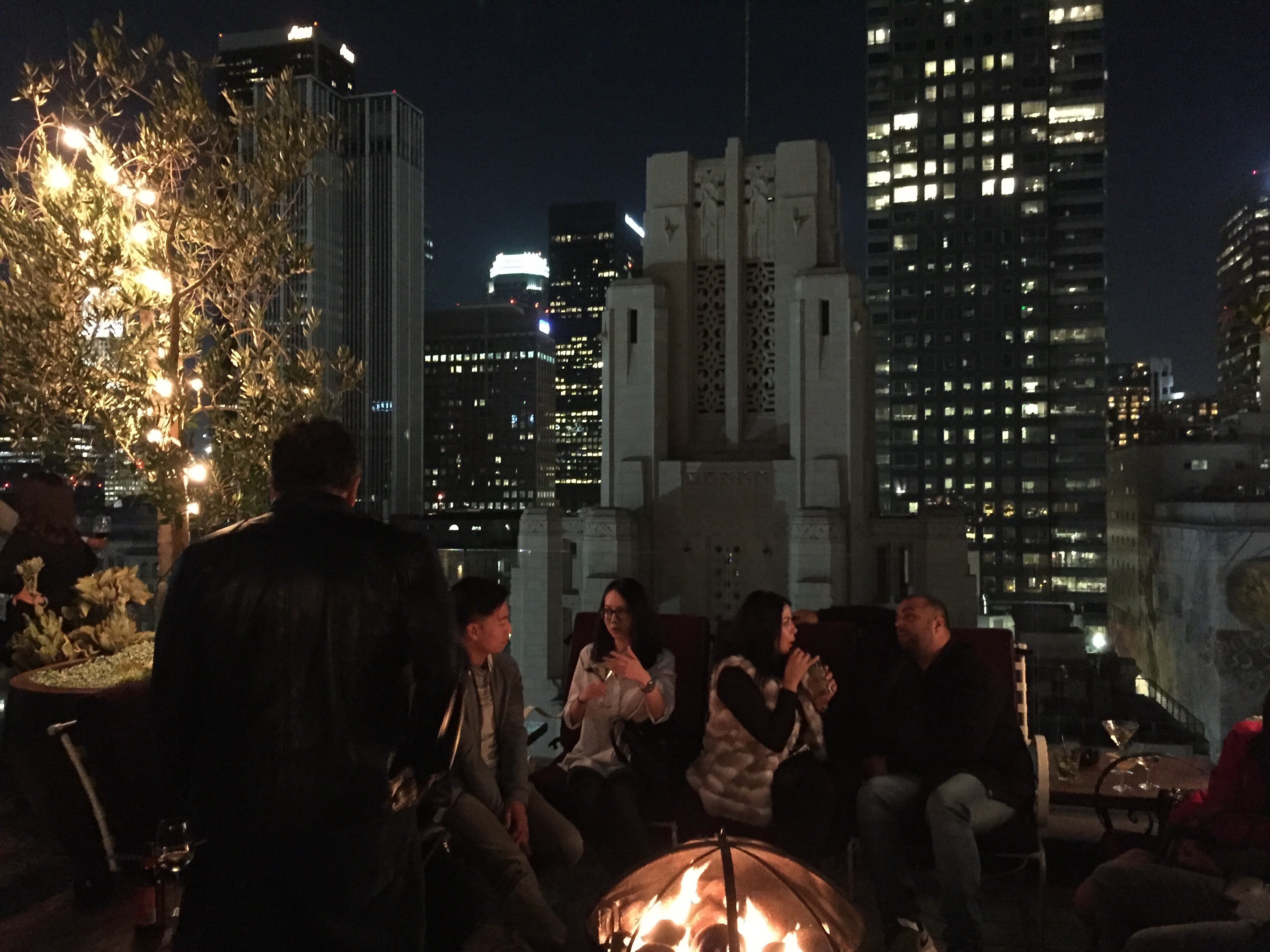 Perched on the 15th floor, the lounge at Perch LA offers seating on outdoor patios with fireplaces and breathtaking views over the Downtown Los Angeles skyline. October 2016.