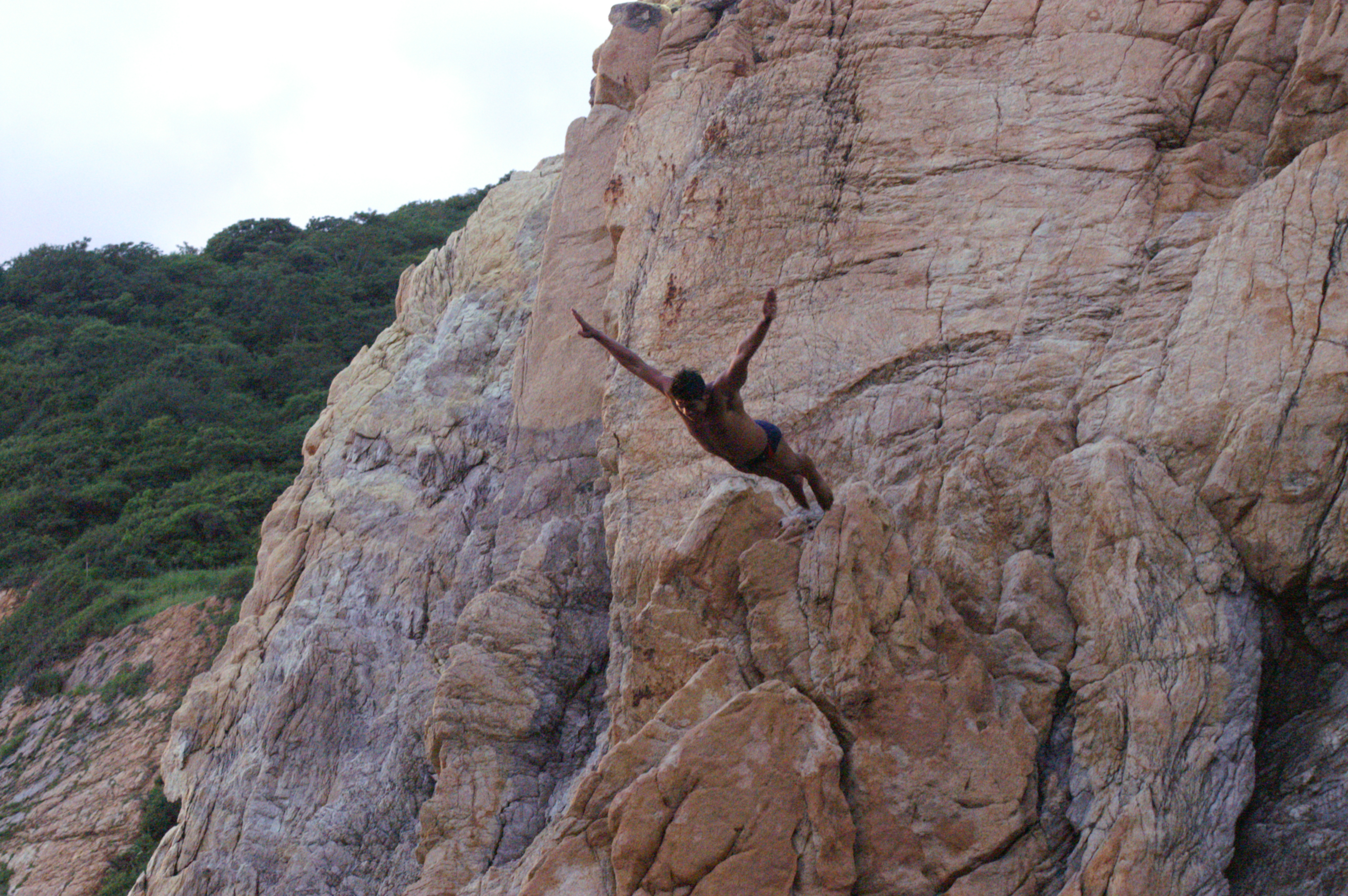 A diver leaps into the void, arms outstretched, from a steep rocky cliff overlooking the ocean. Tourists hold their breath. August 2007