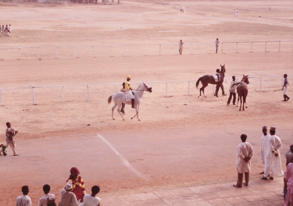 Sur la piste poussiéreuse de l’hippodrome, des jockeys à cheval avancent calmement tandis que d’autres montures sont menées à la main avant la course. Autour d’eux, des spectateurs observent la scène. Mars 1990.