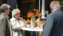 In Düsseldorf, CDU campaigners are talking with passersby around a campaign table in the street. April 2012. À Düsseldorf, des militants de la CDU discutent avec des passants autour d’une table de campagne dans la rue. Avril 2012.