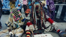 Two boys wearing a mask sit in the street as they are exhausted after many hours of dancing. April 1991. Deux garçons portant un masque sont assis dans la rue car ils sont épuisés après plusieurs heures de danse. Avril 1991.