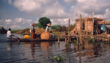 Not all stilt houses in Ganvié stand in water in the dry season. Nevertheless local populations lives in poor hygiene conditions. May 1991. Pas toutes les maisons sur pilotis de Ganvié ont les pieds dans l’eau en saison sèche. Il n’empêche que les populations locales vivent dans des conditions d’hygiène déplorables. Mai 1991.
