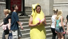 A student dressed as a banana hands out flyers to passersby. August 2005. Un étudiant déguisé en banane distribue des prospectus aux passants. Août 2005.