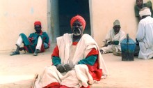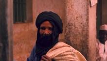 Desert roses are the only touch of color in the Sahel desert. A young Hausa gathers them to thread onto a stem. July 1990. Les roses du désert sont la seule touche de couleur dans le désert du Sahel. Un jeune Haoussa les ramasse pour les enfiler sur une tige. Juillet 1990.