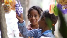 These two girls are fascinated by the Chinese gadgets they find on the local market. April 2010. Ces deux filles sont fascinées par les gadgets chinois en vente au marché local. Avril 2010.