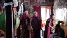 It is the end of the morning prayer in the Likir monastery in Ladakh. The Buddhist monks start leaving the hall. August 2023. C’est la fin de la prière du matin au monastère de Likir au Ladakh. Les moines bouddhistes commencent à quitter la salle. Août 2023.