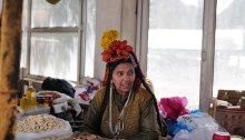 A woman of the Brokpa tribe, an Aryan ethnic group who migrated to India from Persia, is wearing her traditional dress. The main feature is a flower arrangement carried on the head. She sells nuts in one of the stalls of the Leh market in Ladakh. August 2023. Une femme de la tribu Brokpa, une…
