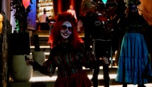 A young woman, wearing Day of the Dead-style makeup, welcomes customers at the entrance of a nightclub in Medellín. August 2025. Une jeune femme, maquillée comme pour le Jour des Morts, accueille les clients à l’entrée d’un bar de nuit de Medellin. Août 2025.